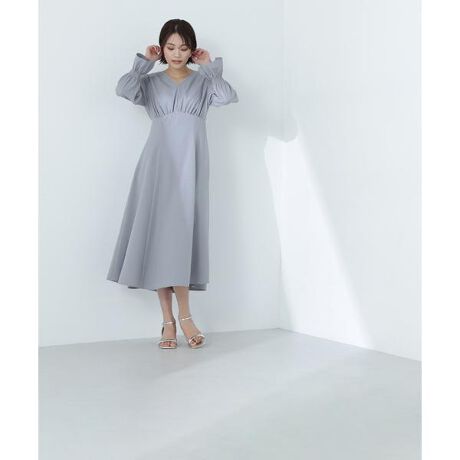 襟ぐりとフロント、ウエストラインにツヤっと光るサテンパイピングを微配色で効かせたディテールがポイントのワンピース。首まわりがキレイに見えるVネックデザインで抜け感もプラス。袖口はシャーリングを施したキャンディスリーブで、フェミニンな印象に。ハイウエストで切り替えを入れたフィット&フレアシルエットで、スタイルアップ効果も期待できます。<素材>クリアなタッチでシワになりにくい合繊素材を使用。<詳細>仕様・後ろファスナー裏地・あり透け感・なし / 光沢・なし / 伸縮性・ややあり 生地の厚さ・普通※モデルの着用画像の場合、光の当たり具合により、実際の色味と異なって見えることがございます。色味は、商品単体の画像をご参照ください。