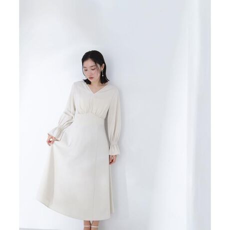 襟ぐりとフロント、ウエストラインにツヤっと光るサテンパイピングを微配色で効かせたディテールがポイントのワンピース。首まわりがキレイに見えるVネックデザインで抜け感もプラス。袖口はシャーリングを施したキャンディスリーブで、フェミニンな印象に。ハイウエストで切り替えを入れたフィット&フレアシルエットで、スタイルアップ効果も期待できます。<素材>クリアなタッチでシワになりにくい合繊素材を使用。<詳細>仕様・後ろファスナー裏地・あり透け感・なし / 光沢・なし / 伸縮性・ややあり 生地の厚さ・普通※モデルの着用画像の場合、光の当たり具合により、実際の色味と異なって見えることがございます。色味は、商品単体の画像をご参照ください。