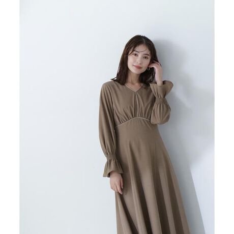 襟ぐりとフロント、ウエストラインにツヤっと光るサテンパイピングを微配色で効かせたディテールがポイントのワンピース。首まわりがキレイに見えるVネックデザインで抜け感もプラス。袖口はシャーリングを施したキャンディスリーブで、フェミニンな印象に。ハイウエストで切り替えを入れたフィット&フレアシルエットで、スタイルアップ効果も期待できます。<素材>クリアなタッチでシワになりにくい合繊素材を使用。<詳細>仕様・後ろファスナー裏地・あり透け感・なし / 光沢・なし / 伸縮性・ややあり 生地の厚さ・普通※モデルの着用画像の場合、光の当たり具合により、実際の色味と異なって見えることがございます。色味は、商品単体の画像をご参照ください。