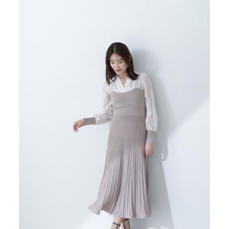透け感の少ないシアー素材とニットワンピースを組み合わせた、軽い着心地の一枚。ニット部分はビスチェディテールで、開襟シャツブラウスとレイヤードしているようなデザインです。<素材>ニットと布帛部分はシアー素材を使用しています。<詳細>仕様・前ボタン裏地・なし透け感・ニットはなし、布帛はややあり / 光沢・ニットはなし、布帛はややあり / 伸縮性・ニットはあり、布帛はなし 生地の厚さ・ニットは普通、布帛は薄手※モデルの着用画像の場合、光の当たり具合により、実際の色味と異なって見えることがございます。色味は、商品単体の画像をご参照ください。
