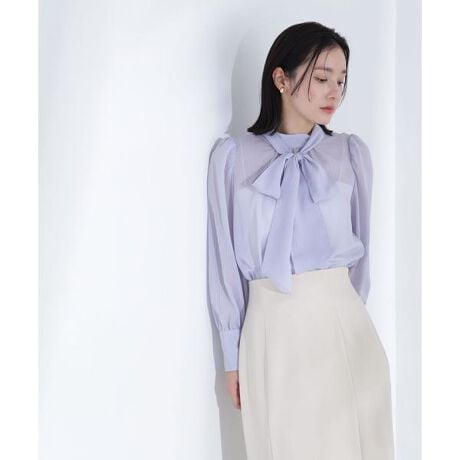 透け感のあるシアーストライプ素材が軽やかに映えるブラウス。共地のリボンをフロントで結ぶとリボンタイブラウスとして、リボンタイを取り外すとシンプルなスタンドネックになる2wayデザインです。リボンタイで着る時は、リボンの中央に開けた釦ホールとブラウスの後ろネックの釦を留めると、リボンが固定されてズレずに結べます。袖はギャザーをふんだんに入れたボリュームスリーブのため、女性らしい印象で着ていただけます。<素材>程よい透け感のあるシアーストライプ素材を使用。軽くて柔らかい素材感です。細かいストライプのピッチなのでキレイめな印象で着られます。<詳細>仕様・後ろボタン裏地・なし透け感・ややあり / 光沢・なし / 伸縮性・なし 生地の厚さ・薄手※モデルの着用画像の場合、光の当たり具合により、実際の色味と異なって見えることがございます。色味は、商品単体の画像をご参照ください。