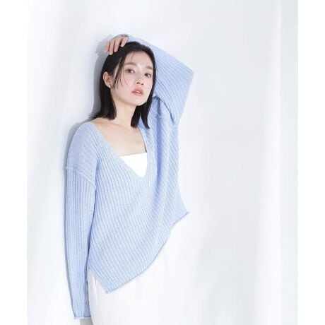 麻タッチのドライな糸を使用したボクシーシルエットでリラクシーな着心地のニット。ゆったりとしたサイズの袖周りやドロップショルダーで体のラインを拾わず、リラクシーに着られるデザインです。深めのVネックなので、襟を後ろに抜いたり、インナーキャミソールを着てヘルシーな肌見せをするのも今年らしくておすすめです。<素材>麻タッチのドライな糸を使用しザクっと編んだニットです。<詳細>仕様・開閉なし裏地・なし透け感・なし / 光沢・なし / 伸縮性・あり 生地の厚さ・普通※モデルの着用画像の場合、光の当たり具合により、実際の色味と異なって見えることがございます。色味は、商品単体の画像をご参照ください。