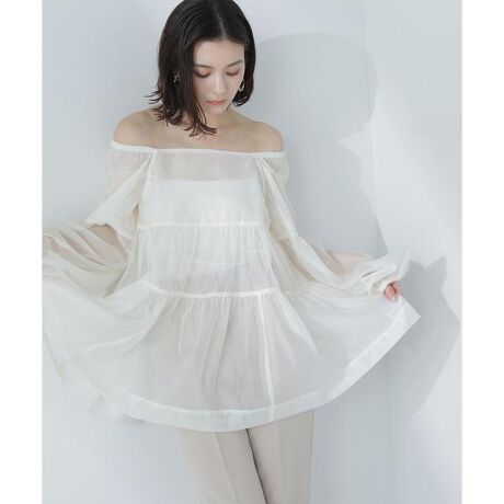 ハリ感のあるシアーな素材を使用した春らしいチュニックは、ふんわりと広がるボリュームが一枚で着映えるデザイン。首元は抜け感があるので、トレンドのボウリボンやチョーカーとも相性が良く、アクセサリーをプラスワンするのもオススメです。裾は幅広に折り返したディテールが高見えに。デニムなどのカジュアルな素材を合わせたスタイリングは勿論、キレイめなボトムスとも相性良く着ていただけます。<素材>ハリ感のあるシアーなオーガンジー素材を使用。インナーが透けにくいよう胸元と袖山は表地を2枚重ねています。<詳細>仕様・開閉なし裏地・なし透け感・あり / 光沢・なし / 伸縮性・なし 生地の厚さ・普通※モデルの着用画像の場合、光の当たり具合により、実際の色味と異なって見えることがございます。色味は、商品単体の画像をご参照ください。