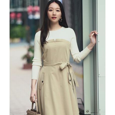 トレンチコート風のポケットディテールが可愛いベアワンピースと、ニットをレイヤードした様なデザインのドッキングワンピース。後ろはゴム仕様で、ウエストもキレイにフィットするため着心地も◎。共地リボンベルトでしっかりウエストマークができ、キレイなフィット&フレアシルエットを演出します。<素材>さらりとしたタッチのストレッチが効いた糸で編んだ、細いリブ編地のニットと、ハリ感のあるコットンタッチな合繊素材のベアワンピースをドッキングしています。<詳細>仕様・後ろファスナー裏地・あり透け感・なし / 光沢・なし / 伸縮性・なし 生地の厚さ・普通 ※モデルの着用画像の場合、光の当たり具合により、実際の色味と異なって見えることがございます。色味は、商品単体の画像をご参照ください。