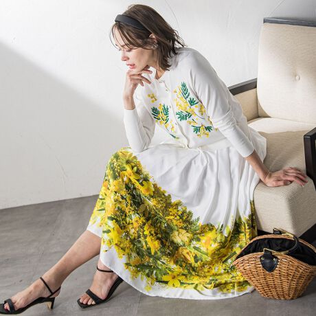 繊細に咲き誇るスイセン、ミモザ、オンシジウム、クスダマツメクサをレイアウトした作品をプリントした、美しいフレアースカート。