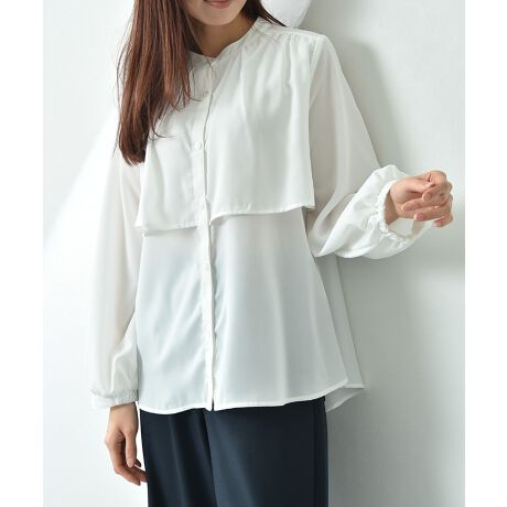 胸元にケープ風ヨークをあしらい、華やかな印象に演出してくれるお勧めなブラウス。コンパクトなバンドカラーがすっきりとした印象に見せてくれ、程よくゆるさのあるサイズ感で女性らしさを引き立ててくれます。ボトムスにインし甘さを抑えた大人っぽい着こなしも◎1ランクアップした大人のスタイルを完成させてくれる優秀なアイテムです。