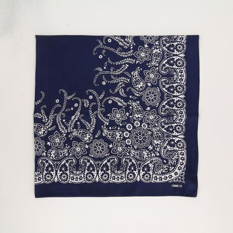 バンダナ柄をシルクツイルにプリントした大判スカーフです。