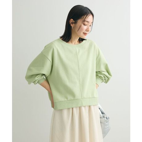さりげないラメ感がスタイリングをパッと明るく印象付ける裏毛プルオーバー。ソフトな肌ざわりで軽やかな着心地がカジュアルスタイルにも最適なデザインです。ショート丈と身幅ワイドを組み合わせたトレンド感あるシルエット。すっきりボートネックにセンターシームのシンプルなディテールも着合わせしやすいポイントです。透け感[なし]