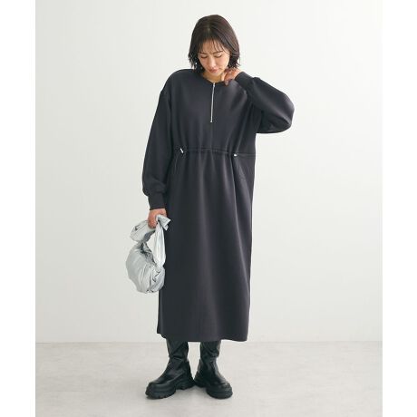 ストレッチ性のあるポンチ素材が快適な穿き心地を叶えるトラックワンピース。ハーフZIPデザインが今年らしスタイリングを後押しします。ストンと落としたIラインシルエットにウエストドロストでメリハリをプラス。1枚で様になるワンピースは、スニーカーを合わせてスポーティーに、ブーツを合わせたきれいめMIXスタイルもおすすめです。透け感[なし]