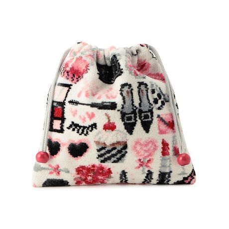 サングラスやパンプス、スイーツ、コスメなど、ひとつひとつのアイテムに目を奪われる「ラブユーソーマッチ!」の巾着です。明るいベースカラーとブラックの組み合わせで、コントラストの効いた表情に。コスメやモバイルグッズ、トラベルグッズ、お菓子とさまざまな物を入れるのに活躍する一品。大切な方への贈り物にもおすすめです。