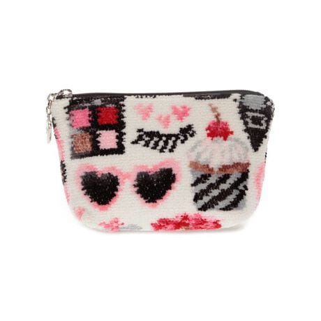 好きな人を想って身に付ける、おしゃれなアイテムたちをちりばめた「ラブユーソーマッチ!」の舟型ポーチSです。ファスナー部分にハートのチャームを採用しているのもポイント。内側には便利なオープンポケットを配しました。コスメ入れにぴったりの、乙女心をくすぐる一品です。