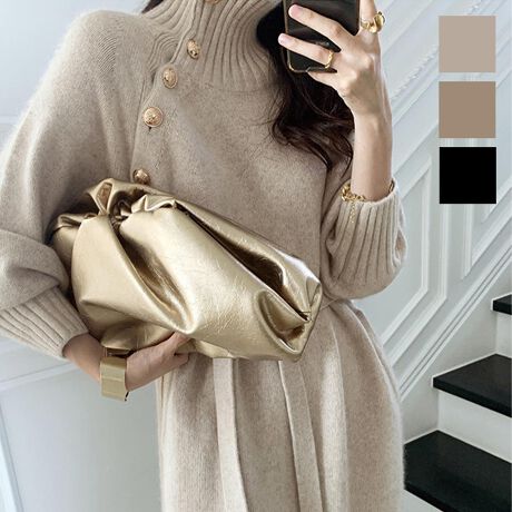 ネック部分のボタン使いがポイントのハイネックニットワンピースが登場♪<br>