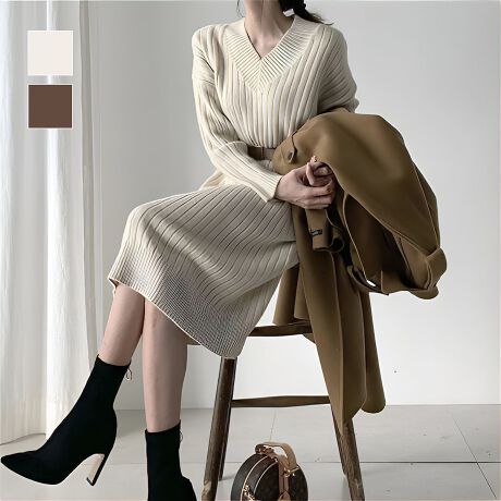 Vネックリブニットワンピース