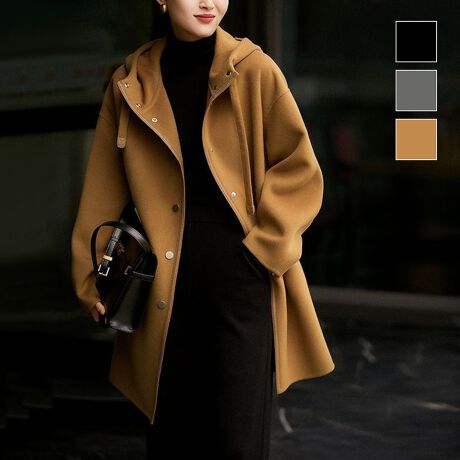 メルトン風の厚みのある素材を使用した大人っぽさのあるフード付きコートが登場♪<br>