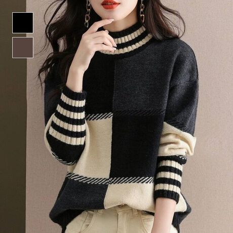 ブロック配色ハイネックニット