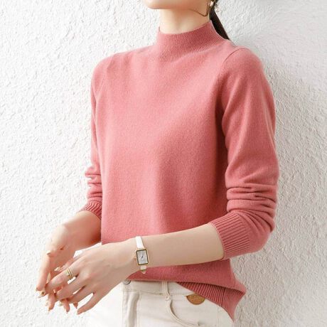 ハイネックなので首元まで暖かく、秋冬まで着られるのも嬉しいポイントです。控えめなハイネックはタートルネックが苦手な方でも着やすく、寒い時期でも首元が暖かいのが◎<br>