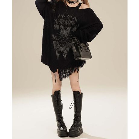 個性的なアシンメトリーのシルエットが特徴のカットソー。バタフライモチーフとダメージ加工が施されたデザインは、ヴィンテージ感を出しつつモードな雰囲気をプラス。裾のフリンジディテールが動きを与え、スタイリングにアクセントを加えます。