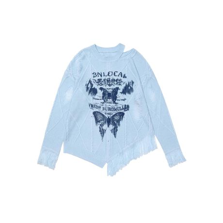 個性的なアシンメトリーのシルエットが特徴のカットソー。バタフライモチーフとダメージ加工が施されたデザインは、ヴィンテージ感を出しつつモードな雰囲気をプラス。裾のフリンジディテールが動きを与え、スタイリングにアクセントを加えます。