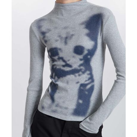 フロントに大胆にあしらわれた猫のグラフィックプリントが目を引くモックネックトップス。ユニークで遊び心溢れるデザインがスタイリングの主役になります。モックネック仕様が全体を引き締め、シンプルながらも個性的な印象を与える一着です。