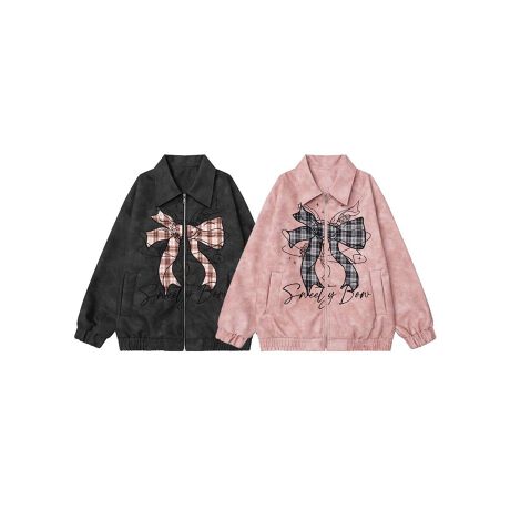 ガーリーなチェック柄リボン刺繍が映える、上品でキュートなスエードブルゾン。