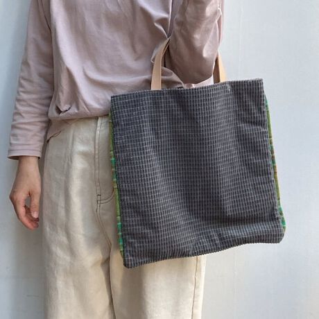 表面がポコポコした生地とサイドのチェック生地との合わせがかわいいシカクトート。ハンドルはレザーを使用していて、経年変化も楽しめます。ノートや本を入れるのにベストな形、サイズ感です。・内ポケット・・・2つ[型番:E6963]