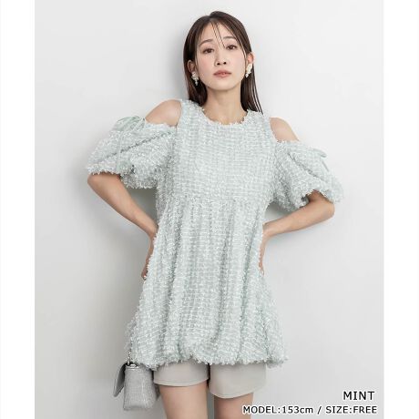 フリンジのデザイン生地とふんわり広がるバブルヘムディティールが、旬なスタイルに導いてくれる一着です。