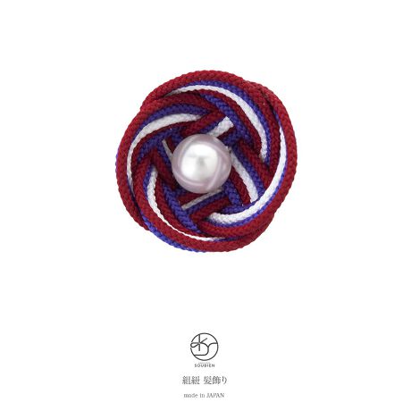 フェイクパールが中心に飾られた、梅の花のような京くみひもが優美なデザインです。