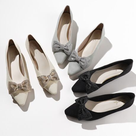 【25春夏新作】ラインストーンリボンフラットパンプス(0595)
