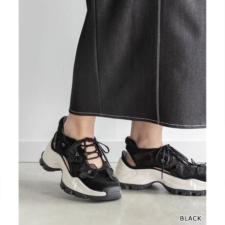 シアーフラワーデザインを施したアッパーに華奢なレースアップとスポーティーなソールのコンビネーションが新鮮なスニーカー。