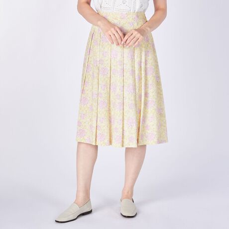 クラシカルなボタニカルプリント柄が華やかなデザインのスカート。膝下丈のレディな丈感。サイドジップ仕様でフロントはすっきりとしたデザイン。プリーツ加工と、フレアで適度なドレープ感のあるスカートがフェミニンなポイント。お手持ちのトップスにプラスして、エレガントなコーディネートが完成します。