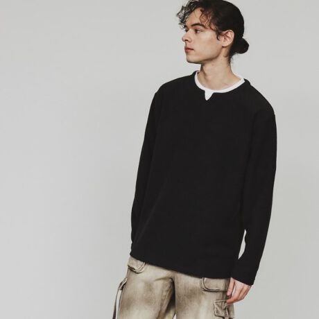 首元のフェイクレイヤードのキーネックデザインがポイント。