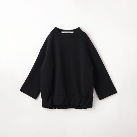 切替えの太いステッチと裾のワイドエラスティックリブが、スウェット風でありながらも綺麗めに見えるポイントになっています。