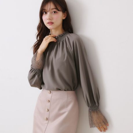 袖口に繊細オリジナルレースのキャンディーカフスをあしらった、シャーリングブラウス