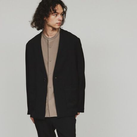 すっきりとした綺麗めなシルエットながら、ラフに着用できるノーカラージャケットになります。
