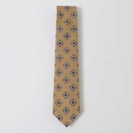 シルク100%を使用したコモンタイ。インパクトの大きいヴィンテージライクな柄の為、Vゾーンを華やかに演出します。裏地にはジャカードで表現したブランドロゴを配置し、細部までこだわった逸品です。