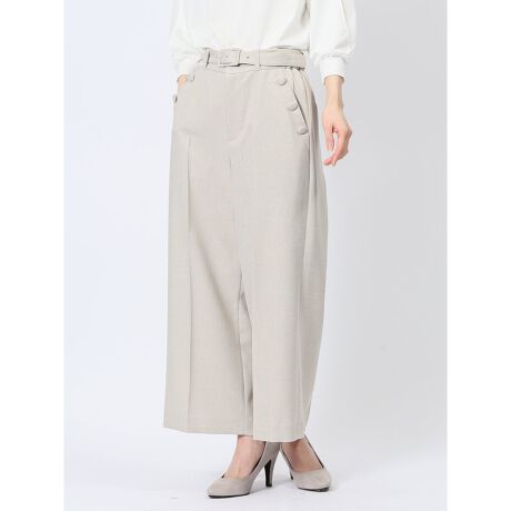 共地のベルトと飾りボタンがアクセントになった、アンクル丈のワイドパンツです。センタープレスでキチンと感のある印象に仕上げています。ウエストはサイドシャーリング仕様で着用ストレスを軽減。前ファスナー仕様、ベルト通し付き、前後ポケット付きです。
