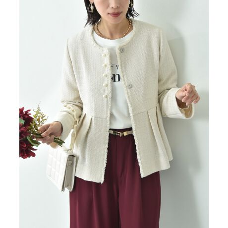 ミックス調の表面感で上品な仕上がりのツィードを使用したノーカラージャケットで、フロントの華奢なパール釦がアクセントに◎またウエスト切替の位置を高めに設定し、スタイルアップ効果も抜群です。フロントはくるみスナップ釦の仕様で、高級感もあり大人な印象に。