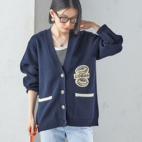 LOGAN KNITTING MILLSの代名詞でもあるサガラワッペンを使用したレタードニットカーディガンは、ブランドらしいキャッチーなグリーン配色と使いやすいネイビーベースの2色展開。