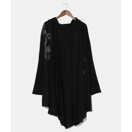 [型番:IDS-5116-2025]ヘナタトゥーのモチーフを刺しゅうであしらった変形メンズカーディガン。刺しゅうには葉、花、ペイズリーが入っており、生命力や活気、幸福などの意味があります。肌触りのいい綿素材で着心地も抜群。フード、ポケットつきで機能性に優れ、ユニセックスに使用できる一枚。