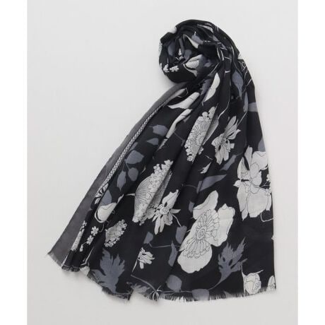 [型番:7CJP5102-2025]大輪の花を繊細なタッチで描いたストール。モダンな色使いで、普段のコーディネートに華を添えてくれます。大判サイズのストールは日よけや冷房対策にも活躍します。春から秋にかけて長く使えるアイテムです。