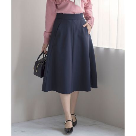 ■デザイン裾の広がりが美しいシルエットのフレアースカートは、動くたびに揺れる裾が魅力的な一枚です。タテのラインを強調するハの字に切った切り替えがポイントで、ウエストをすっきりと見せ、ハイウエストで着用頂くことで脚を長く見せてくれます。脇線をなくすことで自然なフレアー感を出しており、腰回りからウエストにかけて素材とデザイン線ですっきりと吸い付くように見せています。後ろがゴム仕様になっており、イージーな着心地はありながら、後ろのゴムは着用するとなくなる程度の分量感にすることで、ゴムの入ったカジュアルなスカートに見せない様にしています。一枚あると重宝する組曲大人気の名品フレアースカートです。