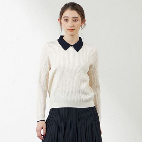 配色・別糸使いのポロ衿がポイントのミニケーブル柄のプルオーバーです。