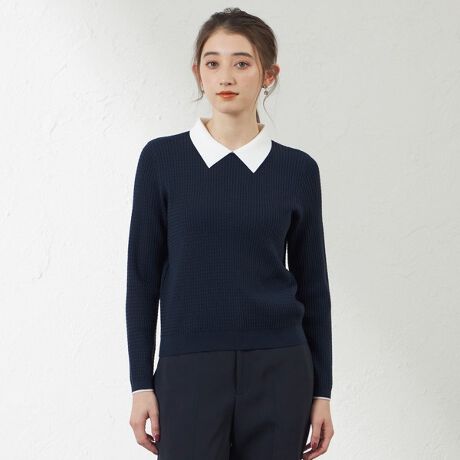 配色・別糸使いのポロ衿がポイントのミニケーブル柄のプルオーバーです。