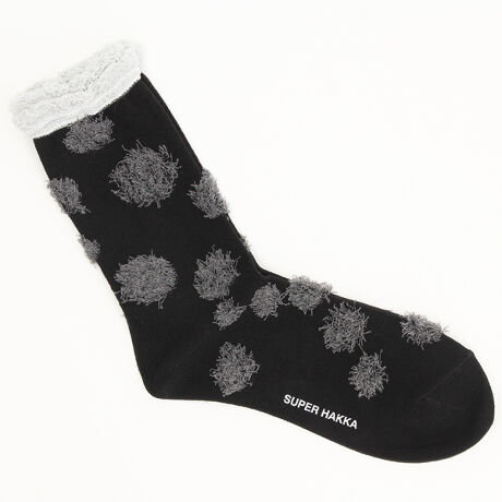 [型番:34060051]ランダムで立体的なドットが特徴のフリンジソックス。シンプルなコーディネートの主役としても大活躍な1足です。履き口には上品な輝きのラメ糸を使用して華やかさをプラスしています。店舗へお問い合わせの際は、下記の品番をお申し付け下さい。[品番:34060051]