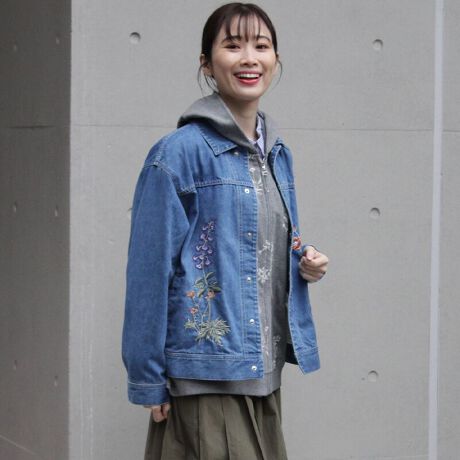 大胆に配置した大きなお花の刺繍がポイントのデニムジャケット/Gジャン。