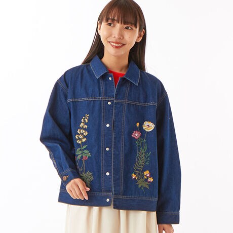 大胆に配置した大きなお花の刺繍がポイントのデニムジャケット/Gジャン。