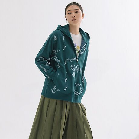 単色の総刺繍で上品なテキスタイルに仕上げた裏毛素材のジップアッププーディ/パーカ。