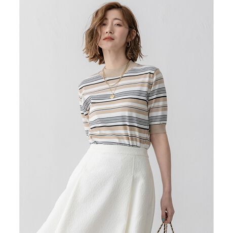 すっきりシルエットのマルチボーダー柄ニット。春らしく明るく、かつ大人っぽい印象に見えるようボーダーの配色にこだわりました。上品な素材感で、シンプルなボトムに合わせやすく、スタイリングのアクセントとして春先から真夏まで活躍します。また、同素材のカーディガンとセットでエレガントに着こなすのもおすすめ。カラーはブラック・ベージュ・ホワイトを組み合わせたブラックベース(#505)、ミント・イエロー・ブラックを組み合わせたミントベース(#563)の2色展開です。