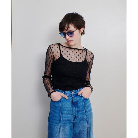 幾何柄の繊細なチュールレースを使用したコンパクトなシアートップス。