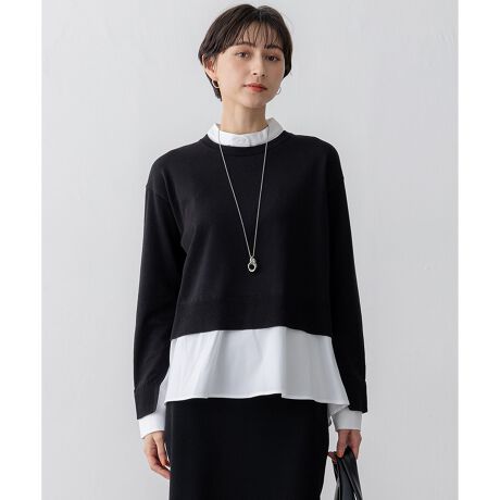 取り外せる襟がセットになったレイヤード風のニットプルオーバー。トレンド感のあるショートレングスのニットに、ゆとりのあるシャツテールが重ね着したようについています。袖下部分にはV字型のスリットにシャツ袖が見える仕様で、きれいめな印象も。1枚でレイヤードしているかのようなこなれたスタイルが完成するので、忙しい朝でもすぐにコーディネートが決まるのがうれしいポイント。カラーは、抜け感のあるグレー(#004)、印象引き締まるブラック(#005)、やわらかな雰囲気のベージュ(#033)の3色展開です。
